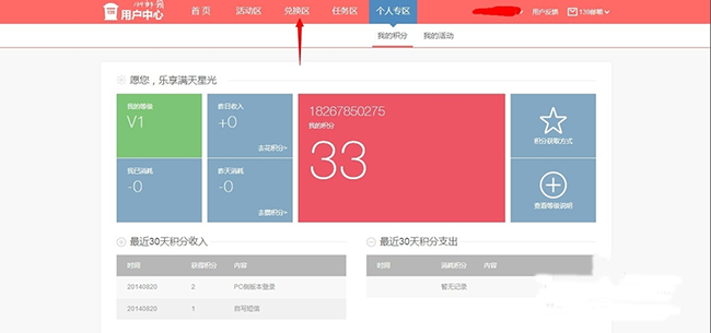 点击积分数值,即可进入用户中心,点击红色箭头所指的兑换区,我们就可以进行积分的兑换。